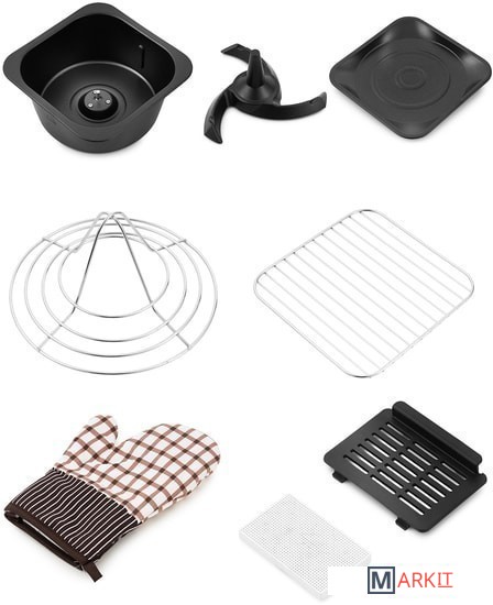 | Комплект поставки | Противень для пиццы - 1 штКонус для курицы - 1 штСмешивающая насадка - 1 штРешетка для гриля - 1 штШнур питания - 1 штПрихватка - 1 штРуководство по эксплуатации - 1 штГарантийный талон - 1 шт |